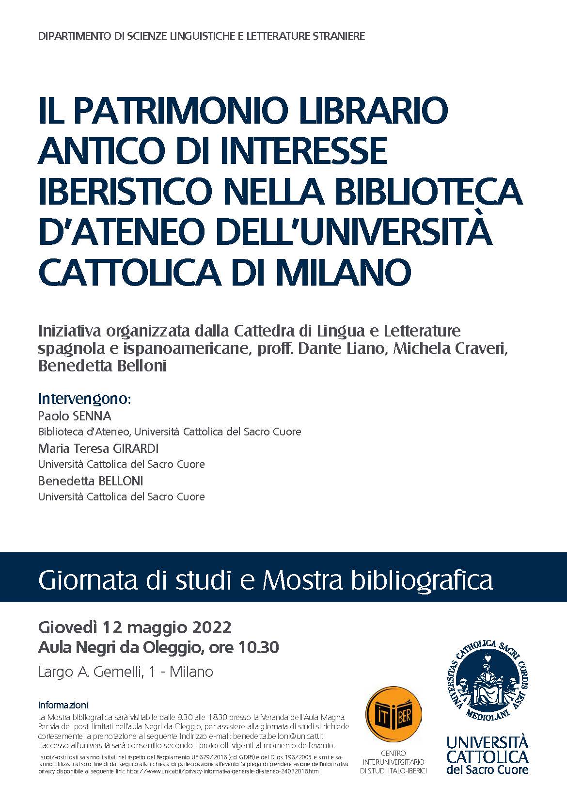 Si svolgerà giovedi’ 12 maggio prossimo, in Aula Negri da Oleggio, alle ore 10.30 (Largo A. Gemelli, 1 – Milano) una giornata di studi e una mostra bibliografica dedicate al Patrimonio librario di interesse iberistico conservato presso la biblioteca di ateneo dell’Università Cattolica di Milano organizzate dalla Cattedra di Lingua e Letterature Spagnola e Ispano-americane della Facoltà di Scienze Linguistiche e Letterature Straniere (Università Cattolica di Milano) e patrocinate da ITIBER, grazie alla partecipazione di Benedetta Belloni e Roberta Ferro.